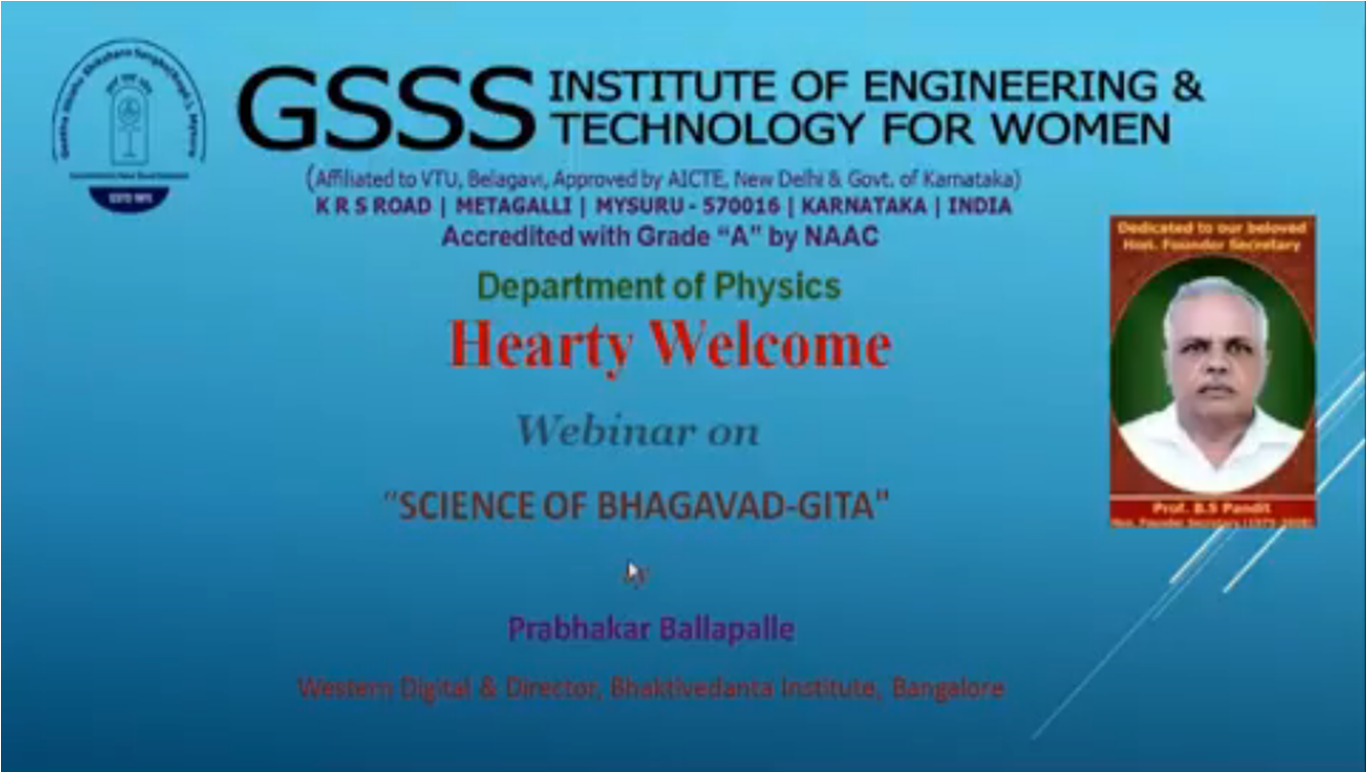 Main Album » Department of Physics, GSSSIETW, Mysuru had organised a Webinar titled “Science of Bhagavad-Gita ” on 29th December 2020 by Sri. Prabhakar Ballapalle, Technologist, Western Digital & Director, Baktivedanta Institute, Bengaluru on the occasion of Gita Jayanti-2020