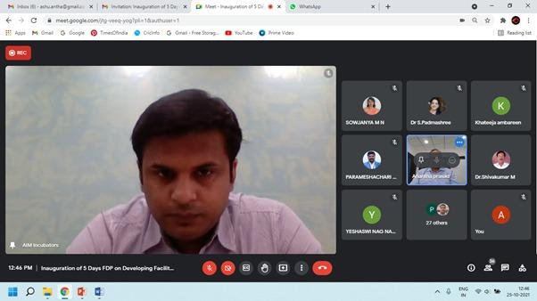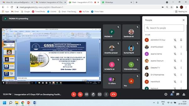 The Inauguration of 5 Days Faculty Development Program on “Entrepreneurship” was organized by ENTREPRENEURSHIP DEVELOPMENT CELL(EDC) of GSSS Institute of Engineering & Technology for Women (GSSSIETW) in association with Atal Incubation Centre Jyothi Institute of Technology Foundation(AIC-JITF) Bangalore in online platform on 25th October 2021.This FDP is being organized with an objective to create a sustainable startup culture among the faculty members of GSSSIETW,Mysore.