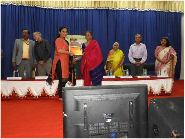 Ms. Priyanka Nayak, EEE Dept, (College Topper-2016-17) is seen receiving the Silver plaque from Smt. L C Sheelavathi, Simha Silks, Mysuru.