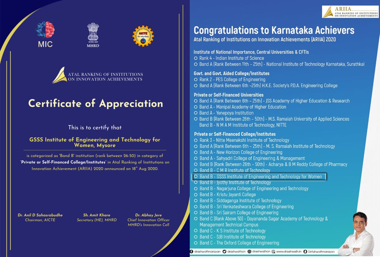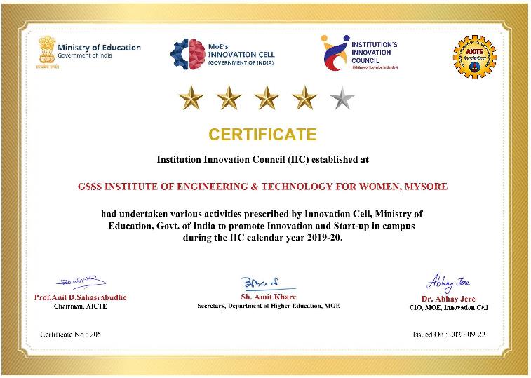 GSSS Institute of Engineering & Technology for Women, Mysuru has been certified by AICTE, New Delhi and MHRD Innovation Cell (MIC ) on 21st November 2018 that it has established Institution’s Innovation Council (IIC) as per the norms of Innovation Cell, Ministry of HRD, Govt. of India to create an innovation promotion eco-system in the campus.